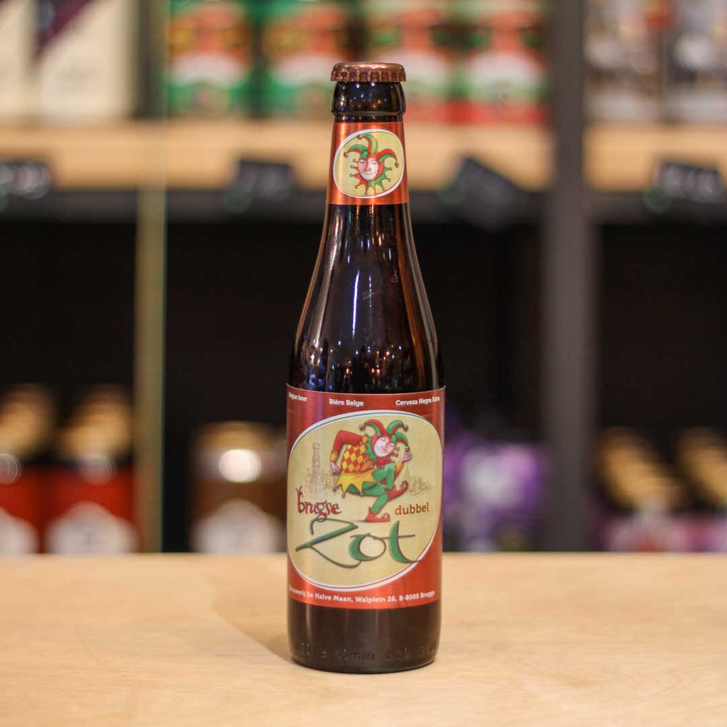 Brugse Zot Dubbel is a dark brown beer, inclining towards ruby red. It is brewed with six special varieties of malt, which give the beer a rich and distinctive aroma. One can discover the scent of honey, almonds, chocolate and even brown sugar.